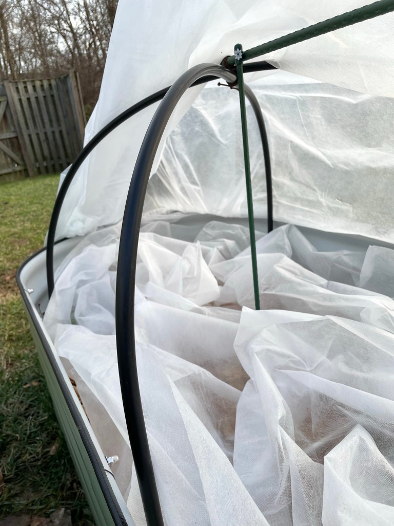 This is may have been one of the easiest one to use if you have one at home already. You could use a clear plastic tote to cover the plants in your raised bed or you could put your pots in at night. You just have to remember to take the cover off when the days are in the upper 50 degrees Fahrenheit.