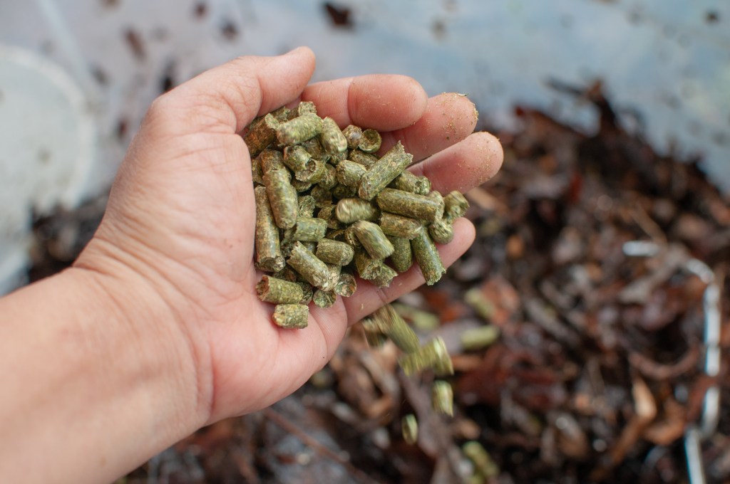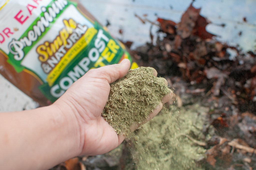 There may be times when you’ll notice that your compost pile isn’t breaking down as fast as want it to be or you have collected a bunch of leaves in the fall and would love to speedup the composting process, one way to increase the nitrogen source is by adding some alfalfa pellets or adding compost starter.