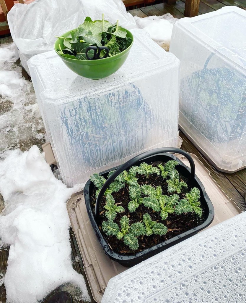 Dishpan is a great container for growing cold hardy plants in the winter. You can create a miniature greenhouse using the a clear storage tote. It will serve as protection from the harsh winter elements and will certain help the plants thrive even in the cold. All you have to remember is to add drainage holes so that it doesn’t clog the container with water whenever it rains.
