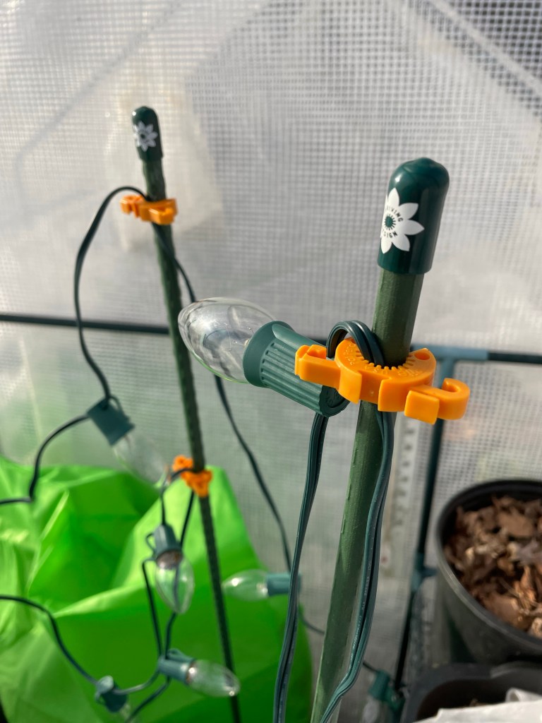 In my setup I apply a precautionary measure to prevent the potential of fire in the greenhouse by not allowing the light bulbs to touch the frost cloth fabric/blanket or any combustible materials. I use Thriving Design C-bites snap clips to easily create a gap and elevate the lights and for better heat distribution.