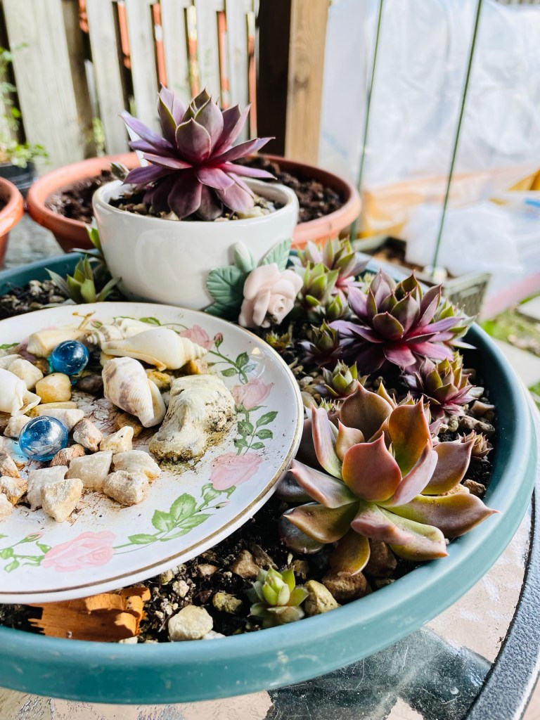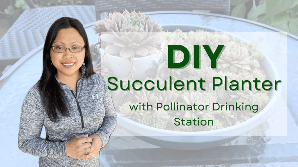 I happen to have some decorative cups and saucer in the house that aren’t being used anywhere. I decided to turn the cup(s) into a little pot by drilling a drainage hole at the bottom. I planted some succulents and loved how it turned out. The saucer serves as the pollinator’s drinking station for the flies, bees and butterflies.