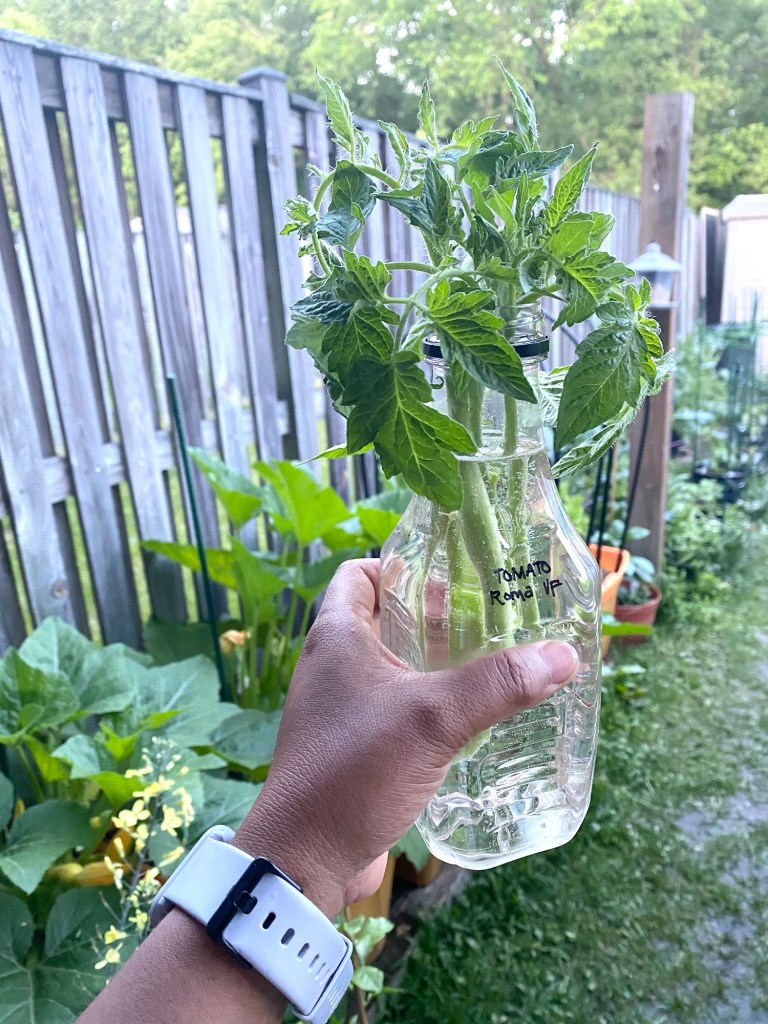 Side note: those pruned side shoots—also known as “suckers”—don’t have to go to waste! You can easily propagate them in water or directly in soil. Just remove the lower leaves and leave 2–3 small leaves at the top so the cutting can focus on developing roots. Within about a week, you should see roots forming, and then you can transplant your new tomato plant wherever you’d like. It’s a simple, budget-friendly way to multiply your tomatoes!