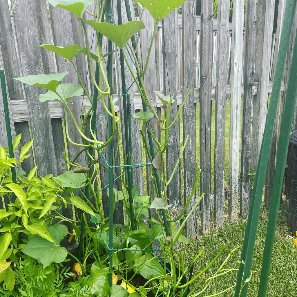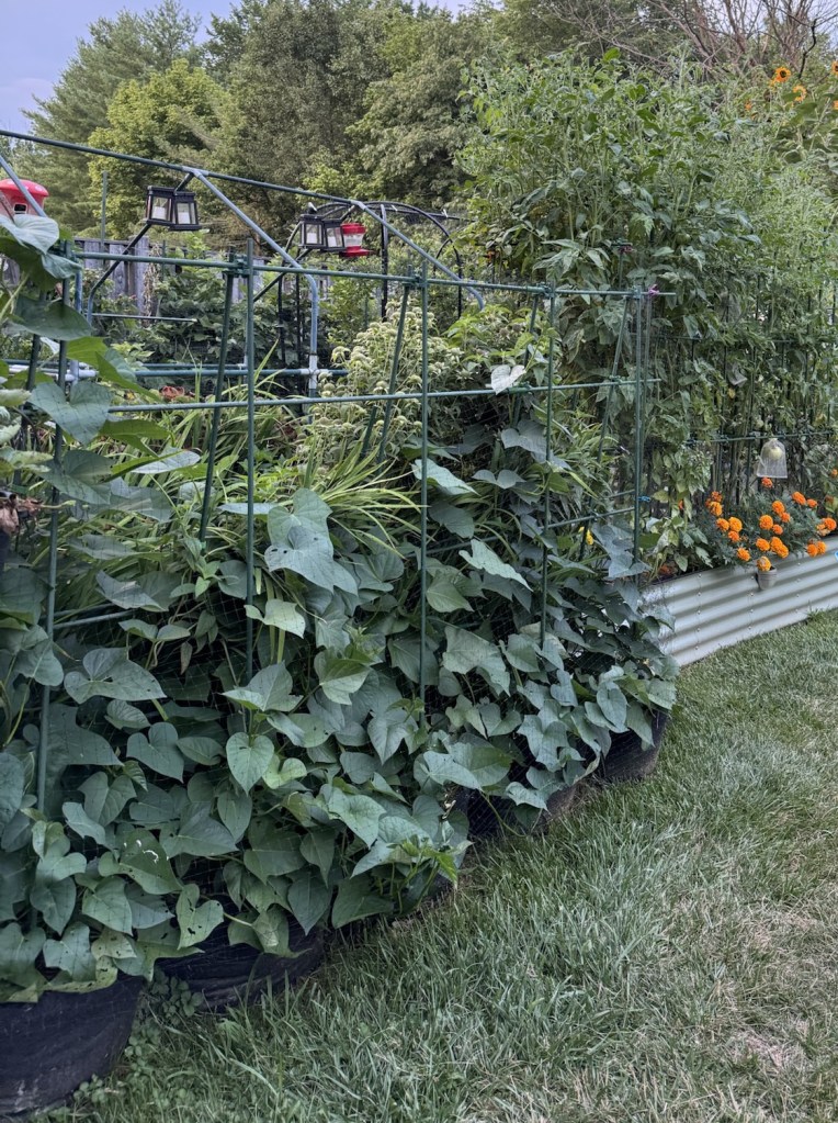 Since then, I’ve been using deer netting to protect not just my sweet potatoes, but my entire garden. It’s an inexpensive and effective way to keep deer out. Just keep in mind—any vine or leaf that grows outside the netting is fair game and will likely get eaten. While the netting can feel a bit restrictive to the plants, it actually helps me manage their growth and keep them contained in a small space.