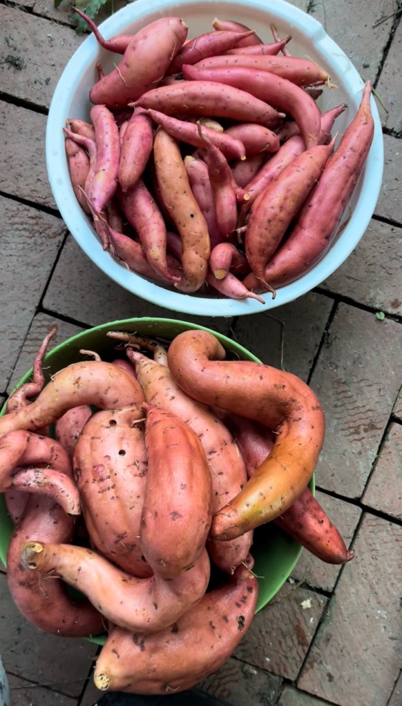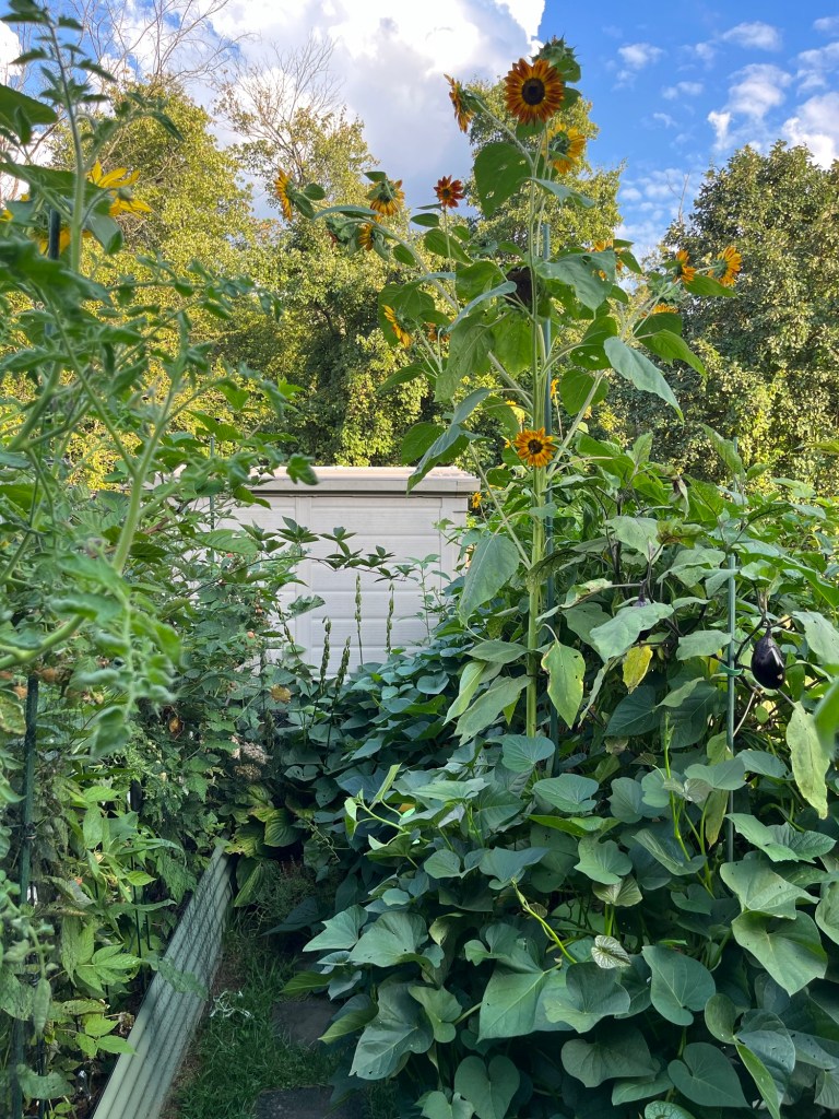 By mid-summer, the sweet potato vines had completely taken over. They sprawled across the bed, shading out my poor peppers and eggplants. 🌿💥