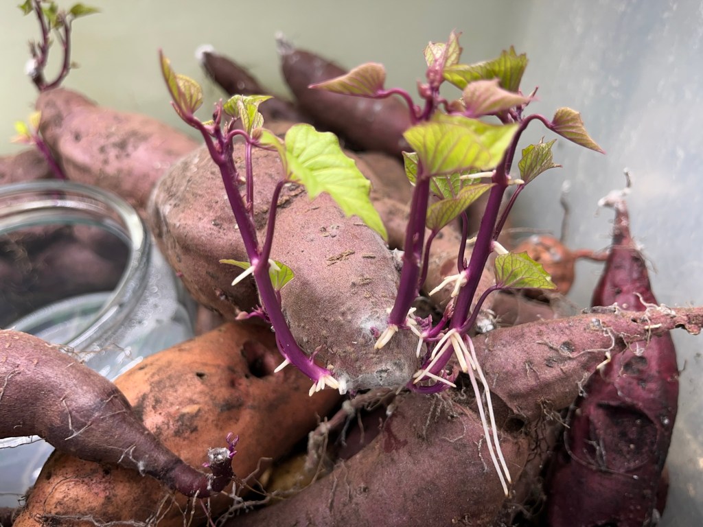 That early sprouting is called chitting. Gardeners often chit seed tubers—like sweet potatoes and regular potatoes—by placing them in egg cartons or trays in a cool, well-lit space. But in my case, my sweet potatoes do it all on their own.