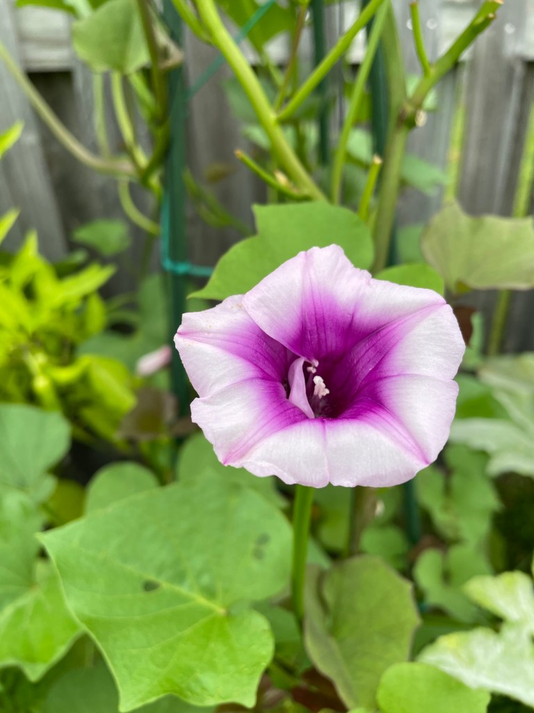 Sweet potatoes sometimes produce small, morning glory-like flowers. While not every variety flowers, when they do, it can be a sign that the plant is mature. But unless you’re trying to cross-pollinate and create a new variety, I usually pinch off the flowers early to redirect the plant’s energy into growing bigger tubers.