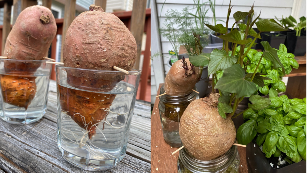 I pot the sprouts indoors and let them grow into leafy tops. Sweet potato leaves are delicious in stir-fries and soups!