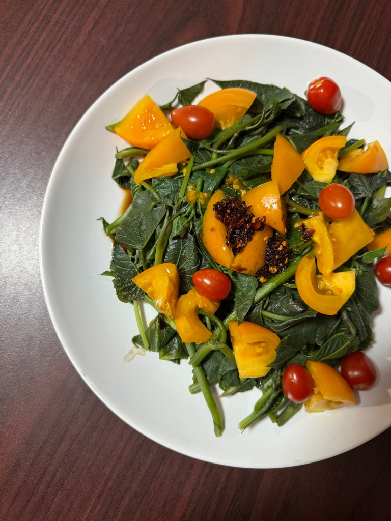 I boiled the tender sweet potato leaves for about 3–5 minutes, then drained them. After that, I tossed them with soy sauce, garlic chili oil, and fresh tomatoes—simple, vibrant, and full of flavor!