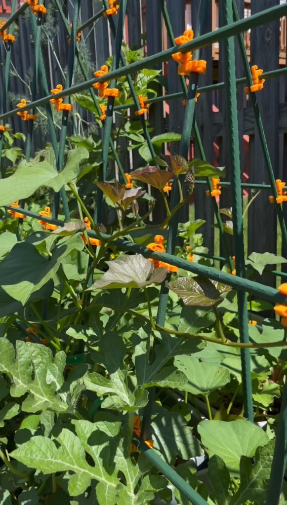 Because sweet potato vines naturally sprawl, I use vertical supports like an A-frame trellis to train the vines upward. This helps save space and reduces shading on nearby plants. I’ve even grown them alongside melons before with great success!
