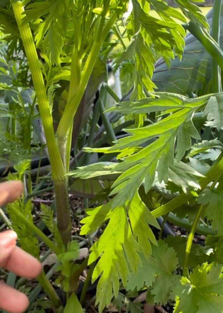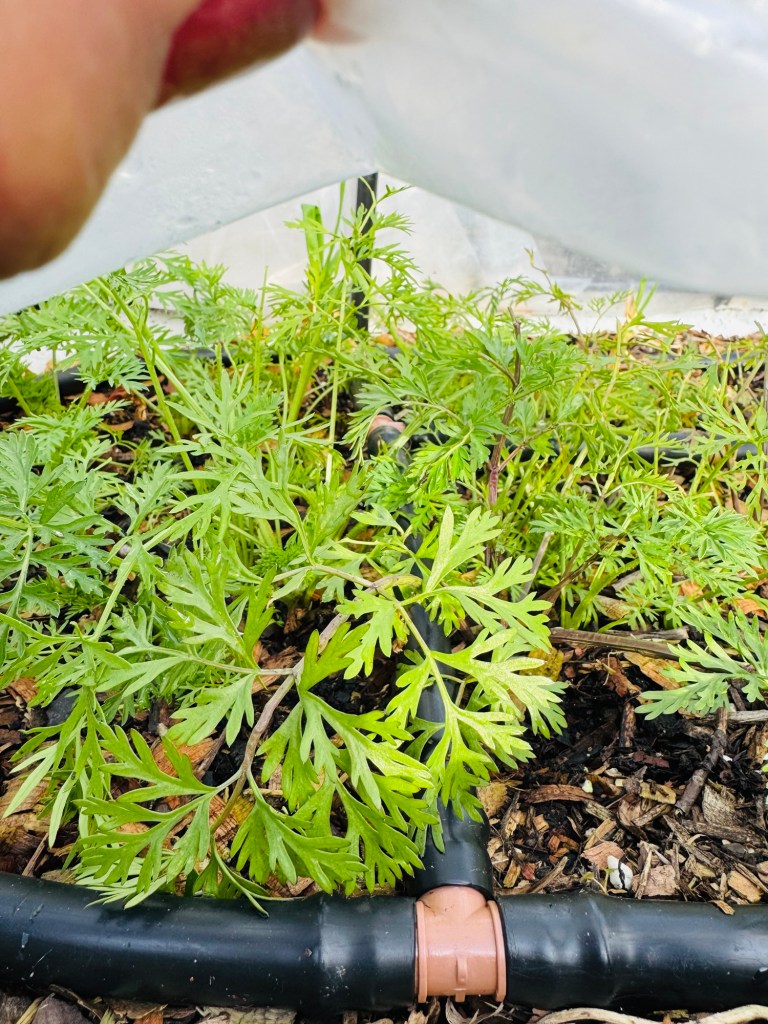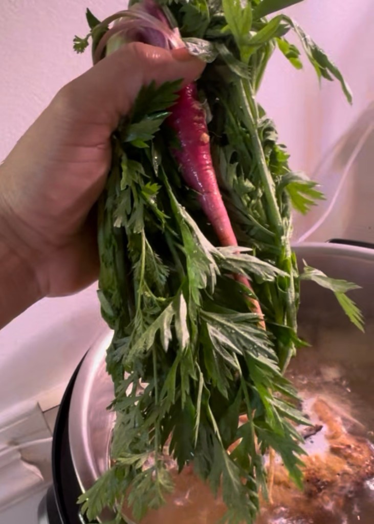 Some of the carrots tried to make a comeback. But the temperature began to shift, and the plants, already stressed, began to bolt—sending up flower stalks instead of focusing on root growth. I refused to let them go to waste. I harvested what I could and used the bolting carrots—tops and all—to make homemade broth, which I freeze and use for soups and stews. It wasn’t the harvest I’d hoped for, but it wasn’t a total loss either.