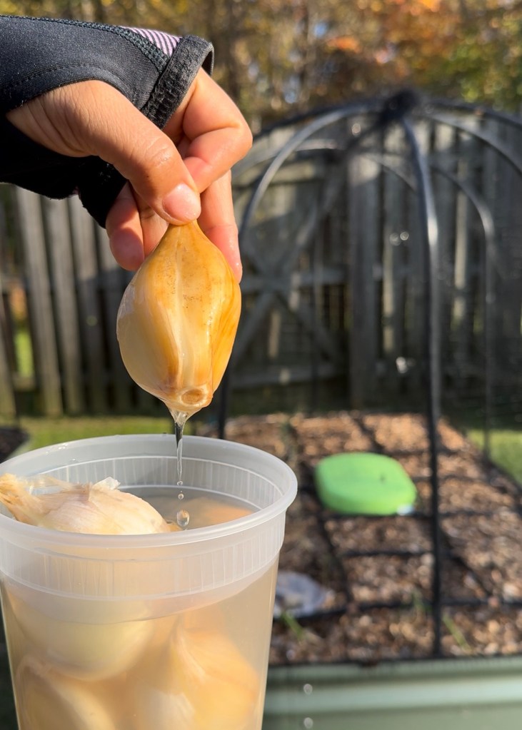 Now, I have bulblets or corms to plant in the fall, which may take 2–3 years to grow into full-sized elephant garlic. I also plan to replant the single-clove garlic to see if it will split into multiple cloves next season.